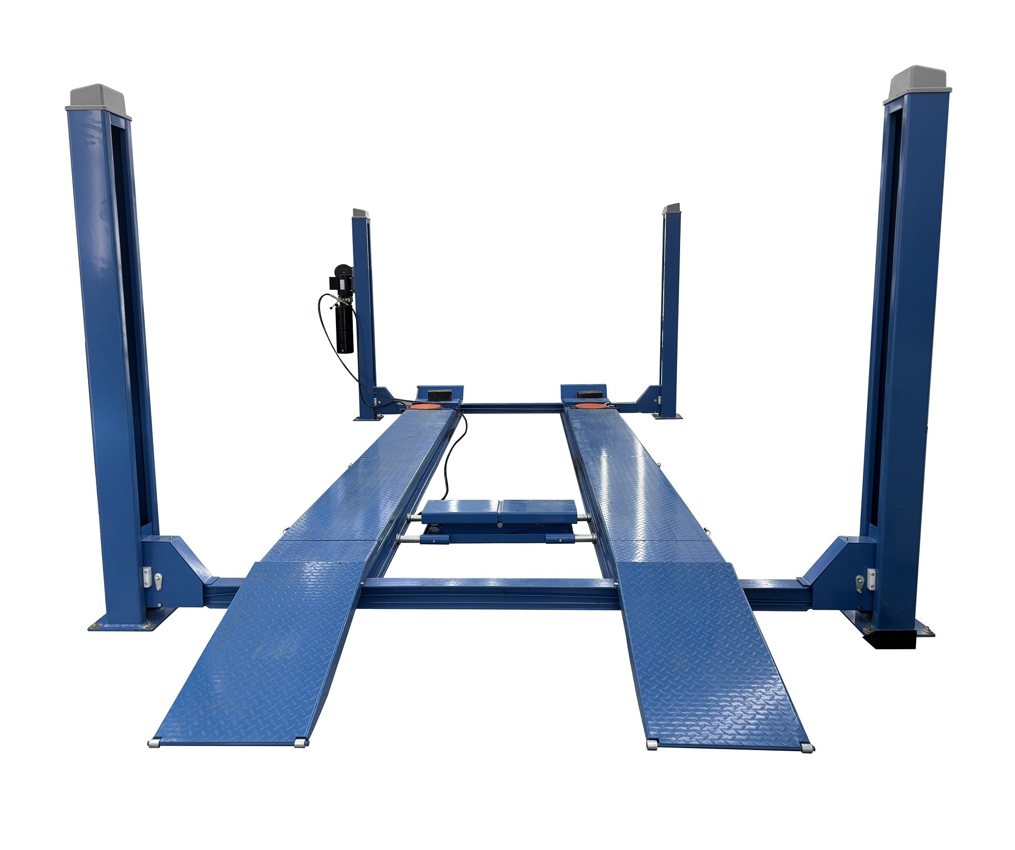 Подъемник электрогидравлический четырехстоечный F4D-4 грузоподъемностью 4 тонны, предназначен для системы сход-развала схождения колес, оснащен местами для поворотных кругов и задними сдвижными платформами, оборудован гидравлической двухточечной траверсой грузоподъемностью 2 тонны.